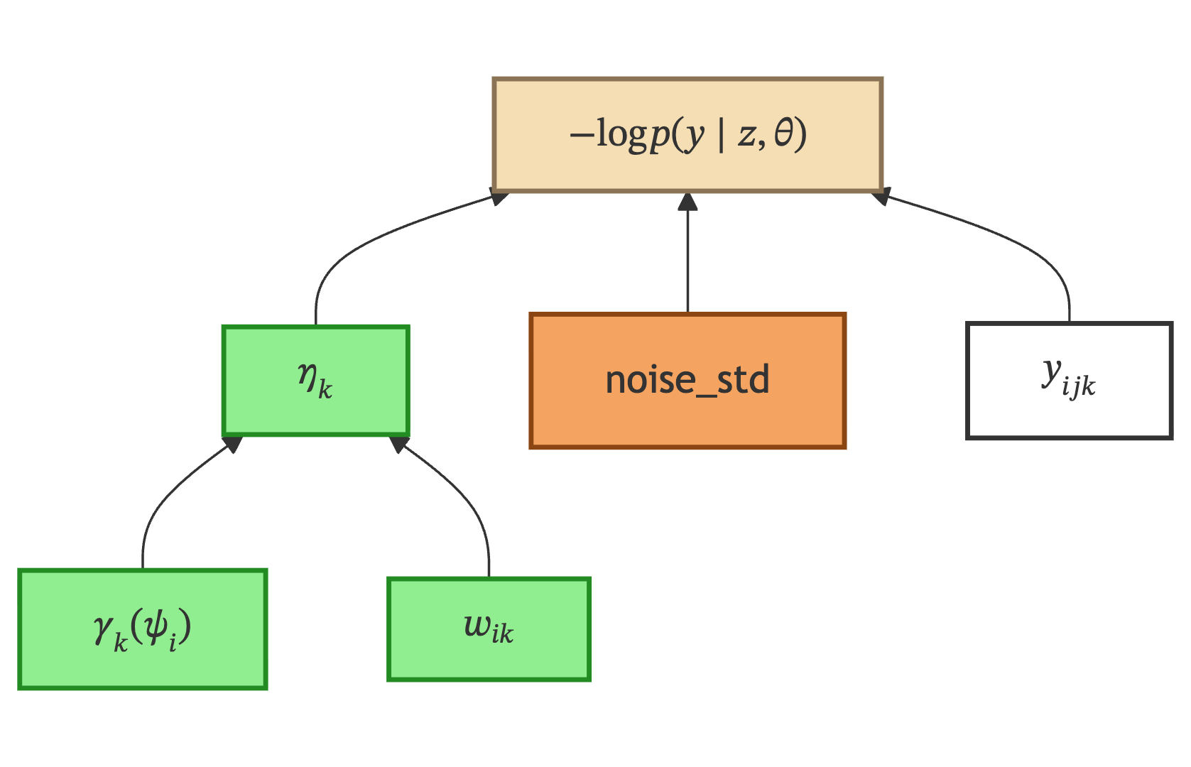 Negative Log-Likelihood is where all three branches converge. The model prediction \(\eta_k\) for each feature is compared against the observed data \(y_{ijk}\) under a noise model parameterized by the noise standard deviation.